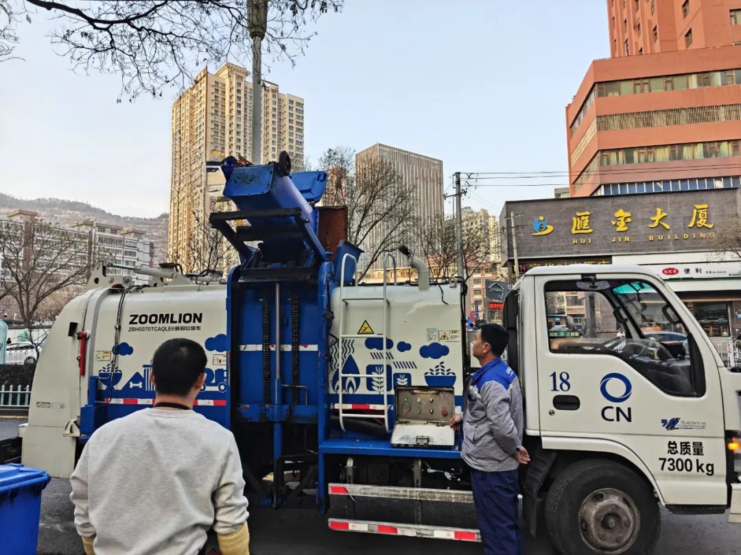 當(dāng)晚8時(shí)許,收運(yùn)車來(lái)到燈火闌珊、熱鬧非凡的蘭州中心。接到通知的餐飲商家,已將餐廚垃圾桶推到了地下車庫(kù)。隨著收運(yùn)車的安全停放,卡、提、倒、放……伴隨著一套行云流水般的操作,一桶桶餐廚垃圾進(jìn)入收運(yùn)車罐內(nèi)。